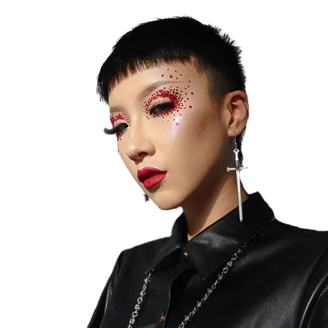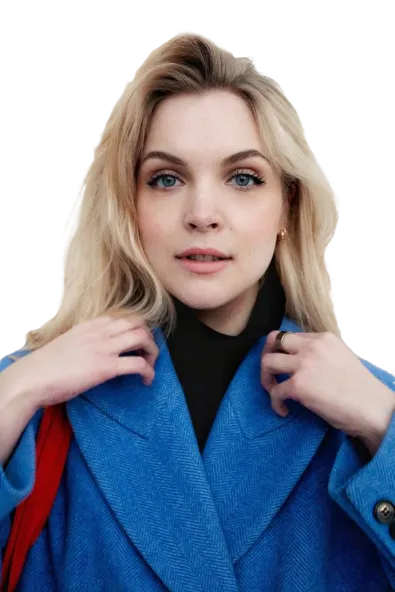 Young woman dressed royally poses with her hand on her cheek